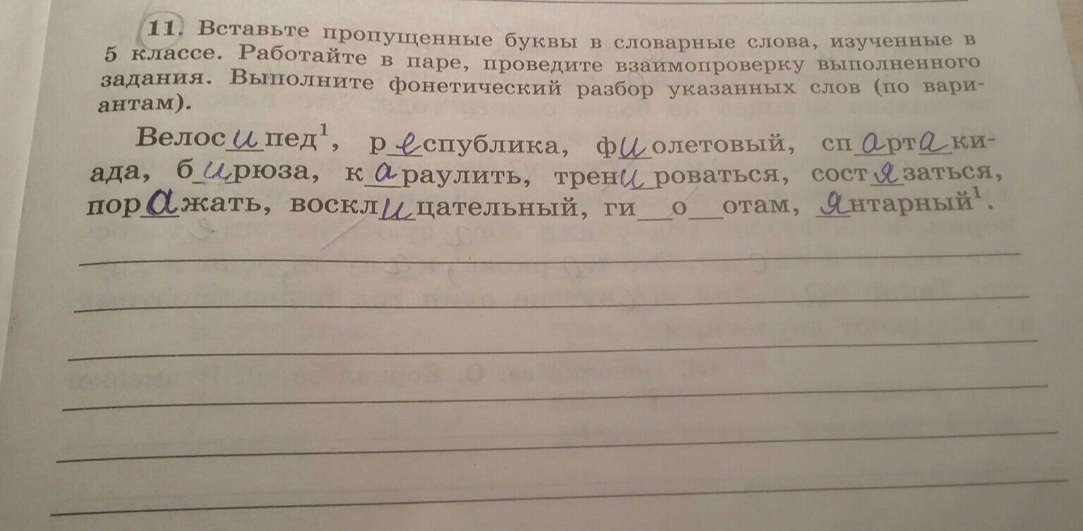 Даю 10 баллов.Помогите пожалуйста.Что за предпоследние слово,как оно пишется?Сделайте фонетический разбор слова "велосипед" и"янтарный".Заранее спасибо.