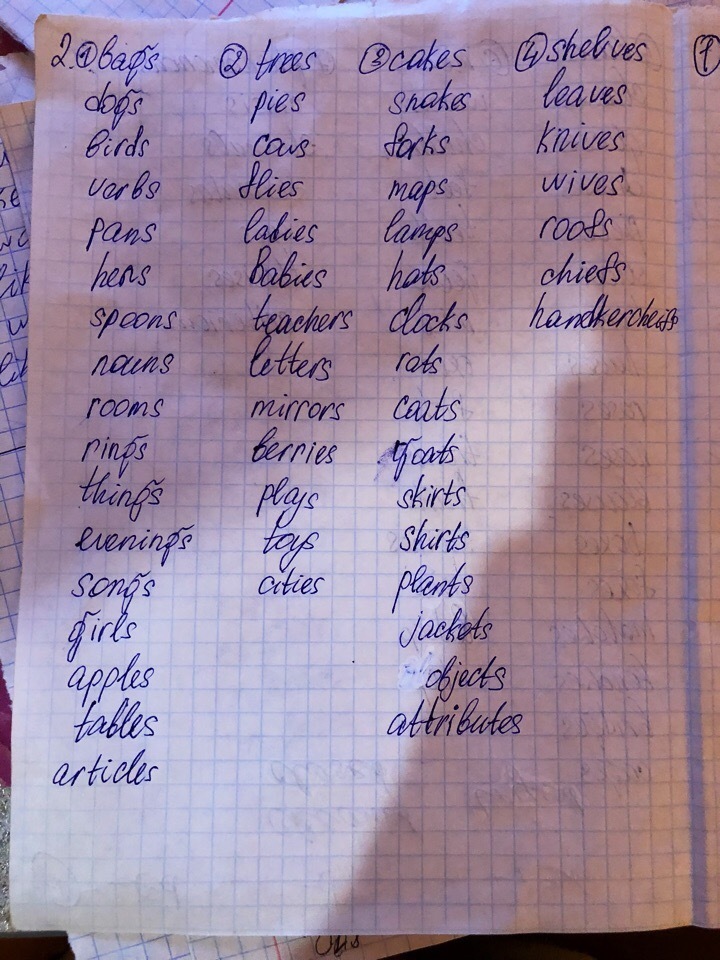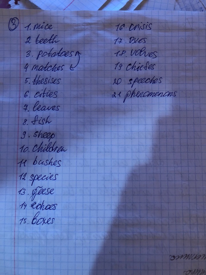 2. tree - trees, pie - pies, cow - cows, fly - flies, lady - ladies, baby - babies, teacher - teachers, letter - letters, mirror - mirrors, berry - berries, play - plays, toy - toys, city - cities (*окончание -s формы множ. числа всех сущ. в этом пункте читается как /z/, так как слова оканчиваются на гласные);