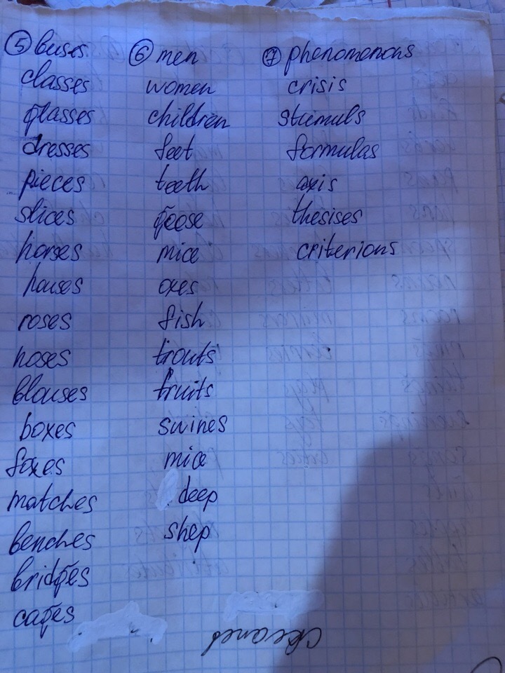5. bus - buses, class - classes, glass - galsses, dress - dresses, piece - pieces, slice - slices, horse - horses, house - houses, rose - roses, nose - noses, blouse - blouses, box - boxes, fox - foxes, match - matches, bench - benches, bridge - bridges, cage - cages, cottage - cottages, bush - bushes (*окончание -es формы множ. числа всех сущ. в этом пункте читается как /iz/);