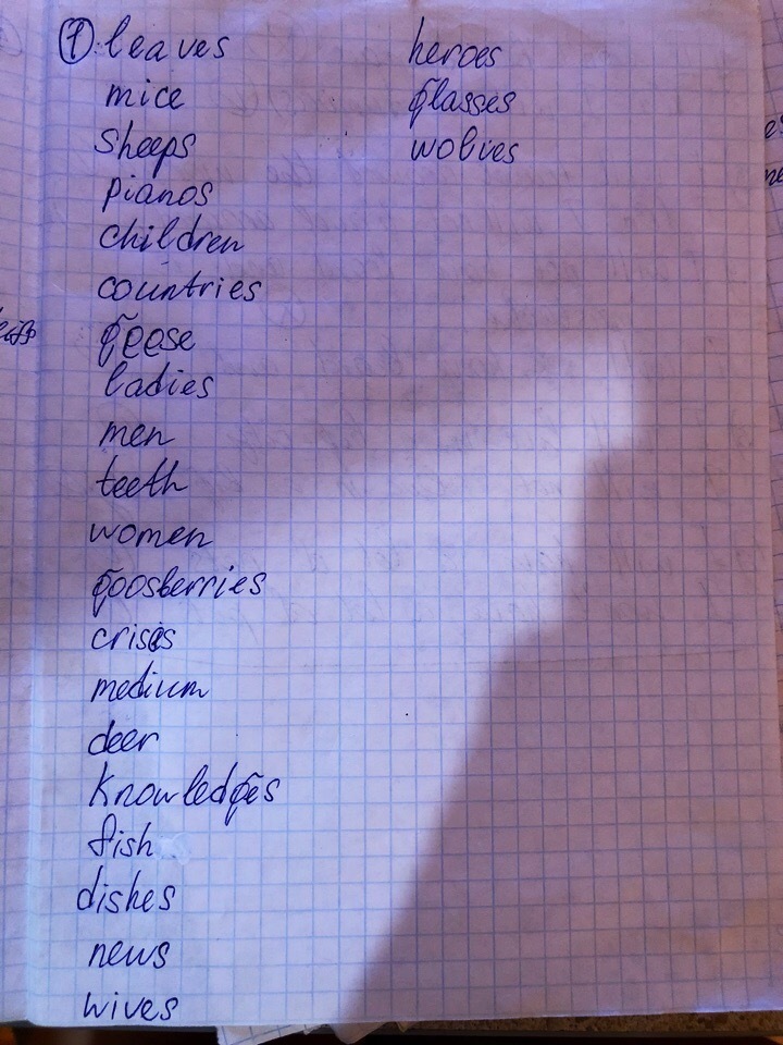 1. leaf - leaves, mouse - mice, sheep - sheep, piano - pianos, child - children, country - countries, goose - geese, lady - ladies, man - men, tooth - teeth, woman - women, gooseberry - gooseberries, crisis - crises, medium - media, deer - deer, knowledge - нет формы множ. числа, fish - fishes (только если речь о биол. видах), dish - dishes, news - всегда только ед. ч., wife - wives, hero - heroes, glass - glasses (стаканы) , wolf - wolves