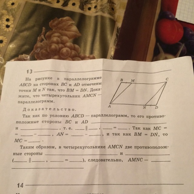 Так как по условию АВМС-параллелограмм, то его противоположные стороны ВС и АD равны и параллельны, т.е. ВС||АD, ВС=АD. Так как МС=ВС-ВМ, АN=AD-DN, то МС=AN.