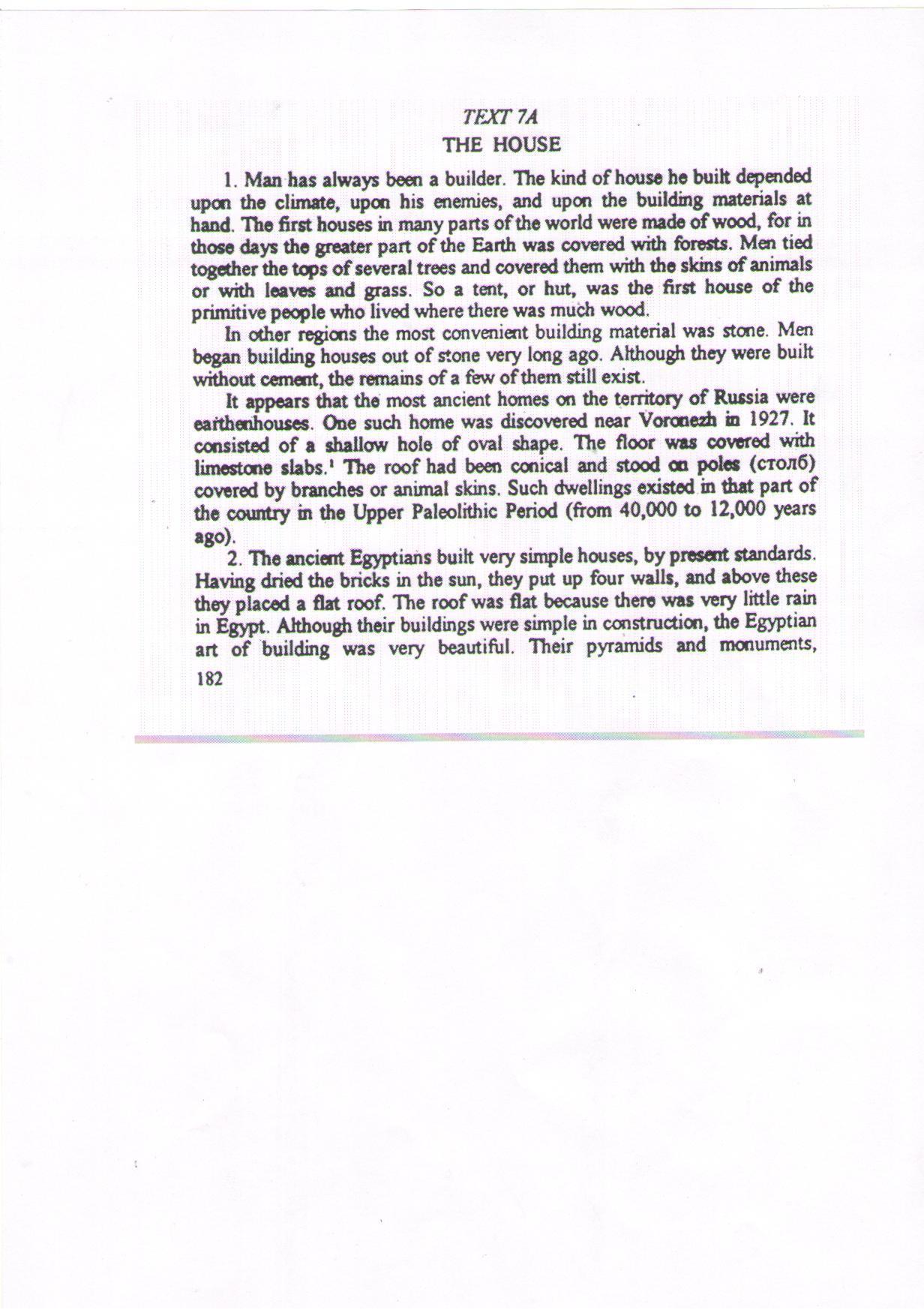 1.Человек всегда был строителем. Дом, построенный им, зависел от климата, от его врагов и от строительных материалов. Первые дома во многих частях мира были сделаны из дерева, потому что в те дни большая часть вместе верхушки нескольких деревьев покрывала их шкурами животных или хлебами и травой. Таким образом, это был первый дом первобытного человека, который жил там, где много лесов было покрыто лесами. Мужчины связаны В других регионах самым удобным строительным материалом был камень. Люди начали строить дома из камня очень давно. Хотя они были построены без цемента, остатки некоторых из них все еще существуют. Похоже, что самыми древними домами на территории России были земляные дома. Один из таких домов был обнаружен около Воронежа в 1927 году. Он состоял из мелкого отверстия овальной формы. Пол был покрыт известняковыми плитами. Крыша была конической и стояла на столбах (cTO26), покрытых ветвями или шкурами животных. Такие жилища существуют в той части страны в верхнепалеолитический период (от 40 000 до 12 000 лет назад).