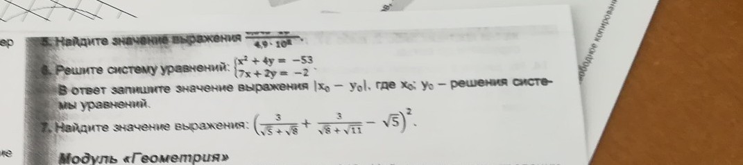 7); ; Big (frac{3}{sqrt5+sqrt8}+frac{3}{sqrt8+sqrt{11}}-sqrt5Big )^2=Big (frac{3(sqrt5-sqrt8)}{5-8}+frac{3(sqrt8-sqrt{11})}{8-11}-sqrt5Big )^2=\\=Big (-(sqrt5-sqrt8)-(sqrt8-sqrt{11})-sqrt5Big )^2=Big (-sqrt5+sqrt8-sqrt8+sqrt{11}-sqrt5Big )^2=\\=Big (sqrt{11}-2sqrt5Big )^2=11-4sqrt5cdot sqrt{11}+4cdot 5=31-4sqrt{55}\\\P.S.; ; (sqrt{a}-sqrt{b})(sqrt{a}+sqrt{b})=a-b