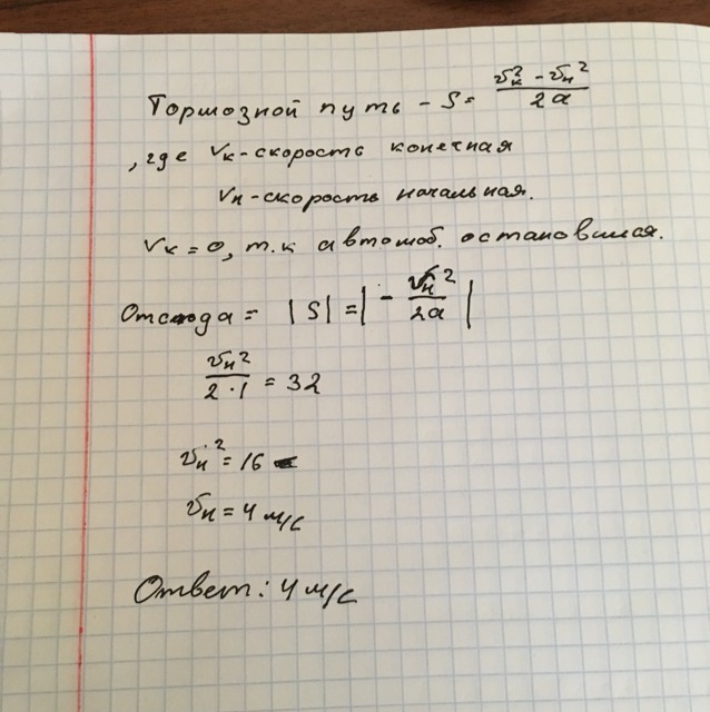 Тормозной путь автомобиля равен 32м, ускорения торможения 1м/м2. Определить скорость, с которой автомобиль начал тормозить, а так же время торможения.
