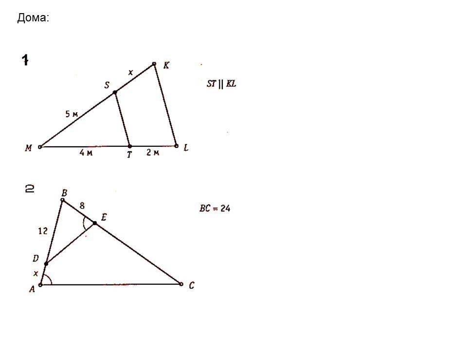 1. МТ/ТL = MS/SK (Теорема Фалеса). x = SK=MS*TL/MT = 5*2/4 = 2,5.