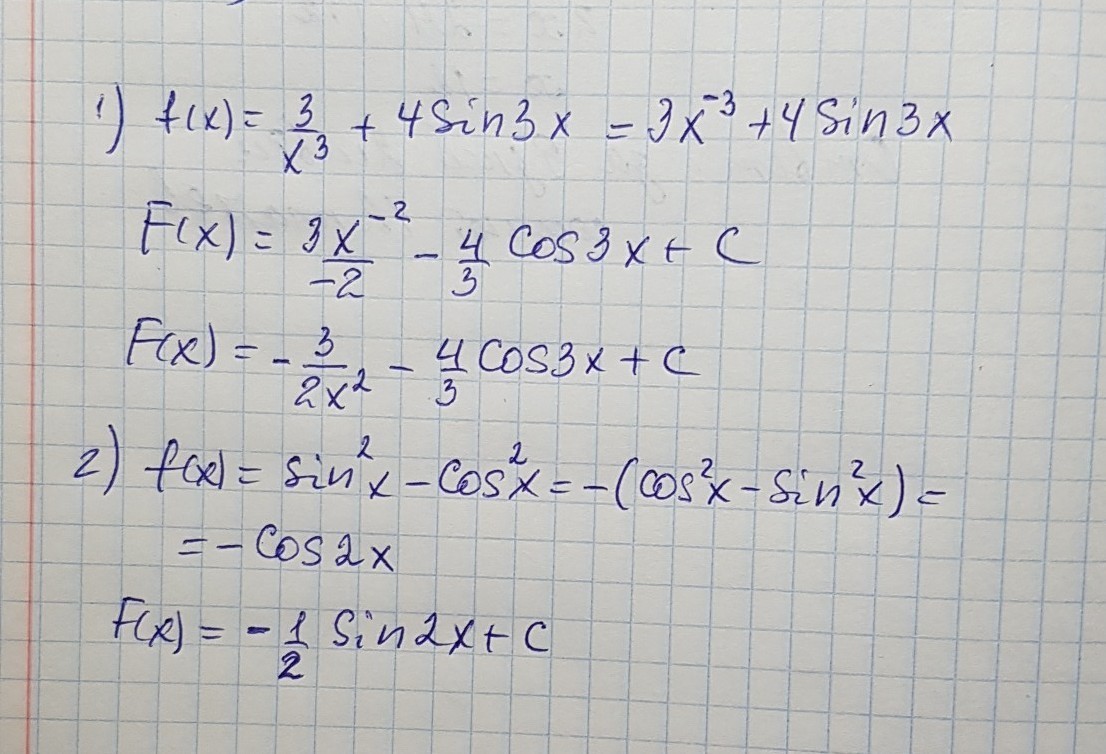 найдите общий вид первообразных для функции у=f(x):1)f(х)=3/х^3+4sin3x. 2)f(x)=sin^2x-cos^2x