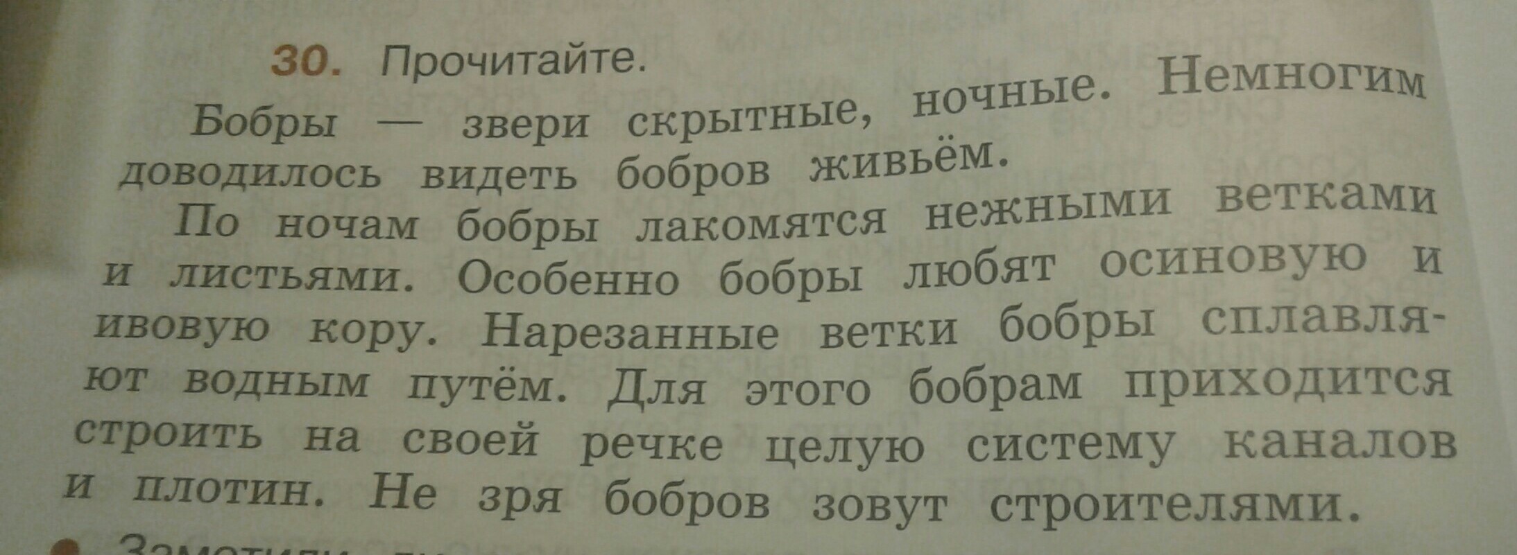 По ночам бобры лакомятся нежными ветками и листьями.Особенно они любят осиновую и ивовую кору.Нарезанный ветки бобры сплавляют водным путём.Для этого им приходится строить на своей речке целую ситсему каналов и плотин.Не зря их зовут строителями