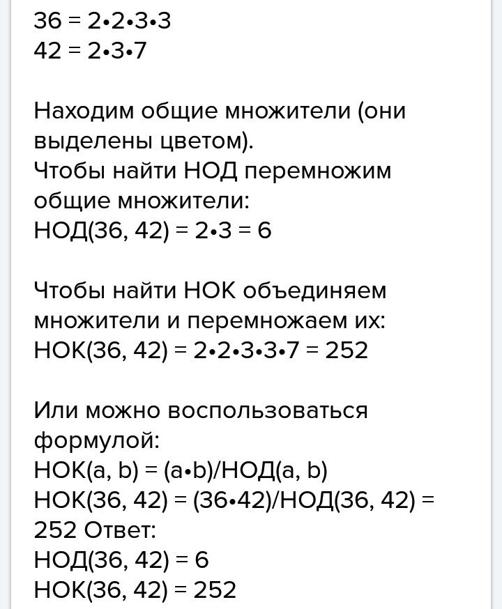 НОК(36, 42) = (36•42)/НОД(36, 42) = 252 Ответ: