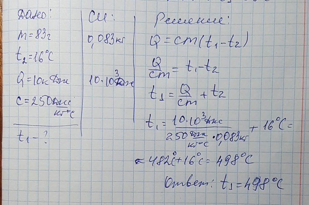 При охлаждении куска олова массой 83 г до температуры 16°C выделилось 10 кДж теплоты. Определи, какой была температура олова до охлаждения. Удельная теплоёмкость олова равна 250 Дж/(кг·°C).