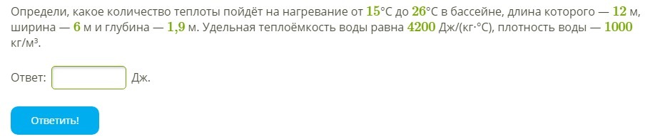 Q=cm(t2-t1) P=m/V=> m=PV; Q= CPV*11= 4200*1000*136.8*11= 6320160000 Дж