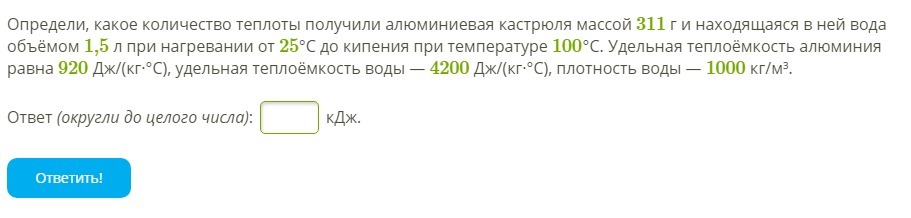 Q=Q1+Q2; Q1=Cв*mв(t2-t1); Q2=Cк*mк*(t2-t1)=>Q=Cк*mк*(t2-t1)+Cв*mв(t2-t1)= 4200*1.5*75+920*0.311*75=493.959 кДж