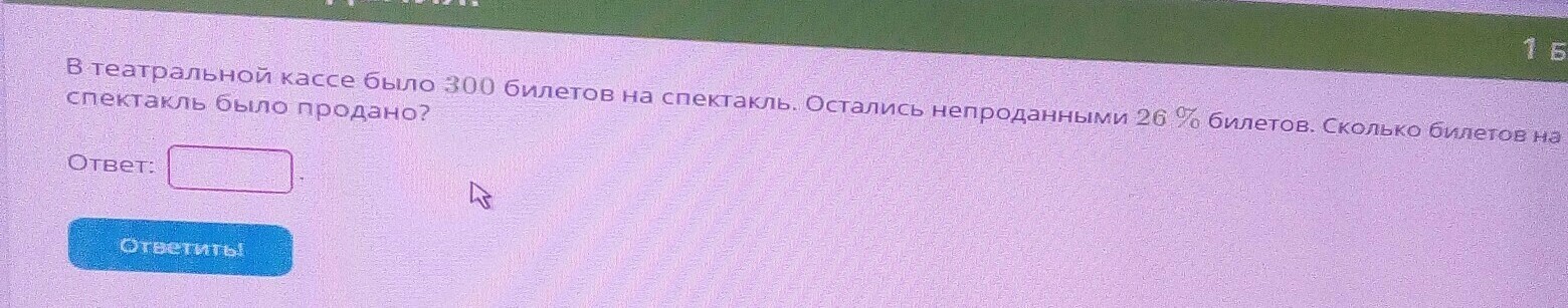 В театральной кассе было 300 билетов на спектакль.Остались непроданными 26% билетов.Сколько билетов на спектакль было продано?Помогите пожайлуста