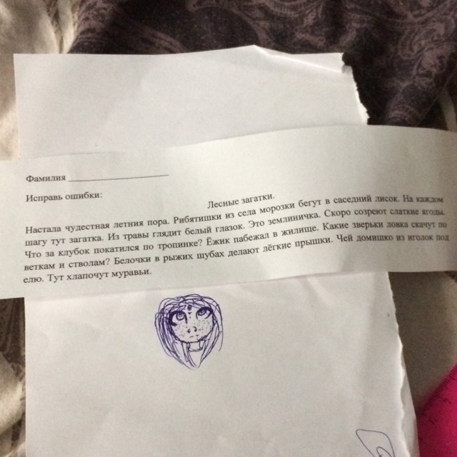 Настала чудесная* летняя* пора. Ребятишки* из села Морозки* бегут в соседний* лесок*. На каждом шагу тут загадка. Из травы глядит белый глазок. Это земляничка*. Скоро созреют сладкие* ягоды. Что за клубок покатился по тропинке? Ёжик побежал* в жилище. Какие зверьки ловко* скачут по веткам и стволам? Белочки в рыжих шубах делают лёгкие прыжки*. Чей домишко из иголок под елью*?* Тут хлопочут* муравьи. (Звездочки в тетради не нужно писать)