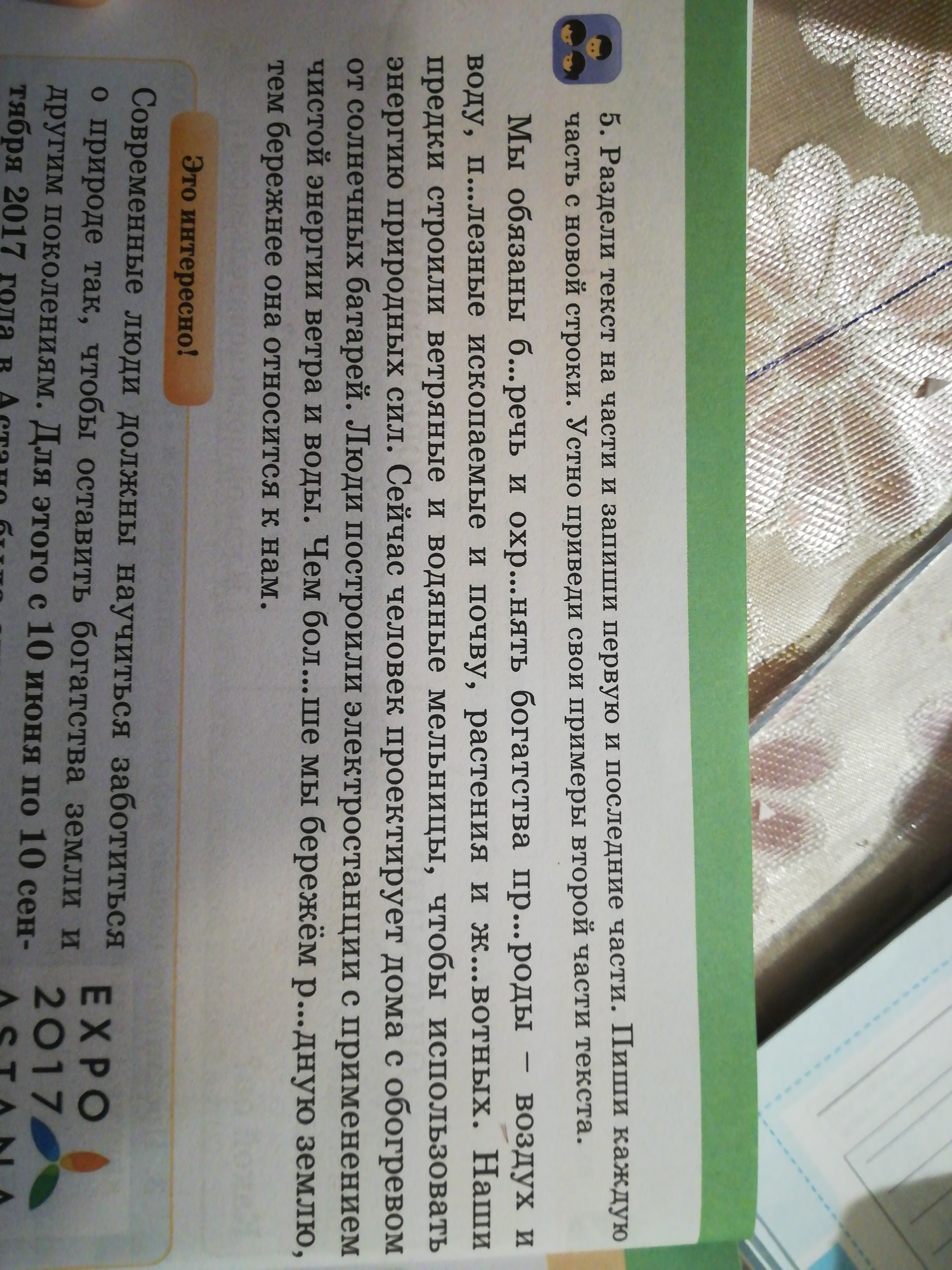 Помогите пожалуйста.разделите текст на части и запишите первую и последнюю часть. Пишите части с новой строки .: Мы обязаны беречь и охранять богатства природы- воздух и воду , полезные ископаемые и почву, растения и животных. Наши предки строили ветряные и водяные мельницы, чтобы использовать энергию природных сил. Сейчас человека проектируют дома с обогревом от солнечных батарей. Люди построили электростанции с применением чистой энергии ветра и воды. Чем больше мы бережем родную землю, тем бережнее она относится к нам.