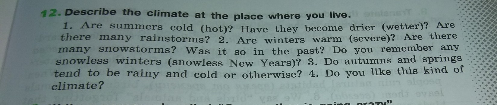 1. Холодно или горячо ли летом? Стал ли климат суше или влажнее? Есть ли дождевые грозы? Зимой очень прохладно или сыро? Много ли снежныхгроз? Было ли это в прошлом? Помните ли вы не снеговые зимы на новый год? Осенью и весной дождливо и холодно или как? Вам нравиться такой климат?