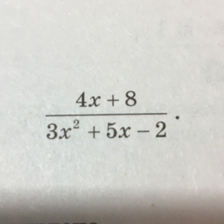 frac{4x+8}{3x^2+5x-2} = frac{4(x+2)}{3x^2+6x-x-2} = frac{4(x+2)}{3x(x+2)-(x+2)} = frac{4(x+2)}{(x+2)-(3x-1)} = frac{4}{3x-1}