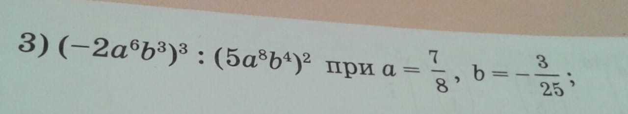 ( - 2 {a}^{6}  {b}^{3} ) ^{3}  div  {(5 {a}^{8} {b}^{4} ) }^{2}  =  - frac{8 {a}^{18}  {b}^{9} }{25 {a}^{16} {b}^{8}  }  =  -  frac{8}{25}  {a}^{2} b =  - 0.32 {a}^{2} b \  -  frac{8}{25}  {a}^{2} b =  -  frac{8}{25}  times  {( frac{7}{8} )}^{2}  times ( -  frac{3}{25} ) =  frac{8 times 49 times 3}{25 times 64 times 25}  =  frac{49 times 3}{200 times 25}  =  frac{147}{5000}