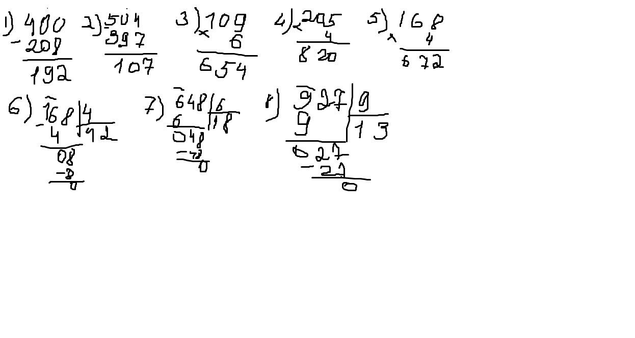400-208=192; 504-397= 125 ; 109*6=654; 205*4=820; 168*4=672; 168:4=42; 648:6=108; 927:9= 103