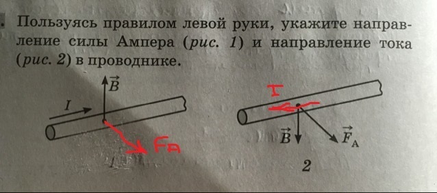 Помогите, пожалуйста!!! Пользуясь правилом левой, руки укажите направление силы ампера (рис.1) и направление тока (рис. 2)в проводнике.