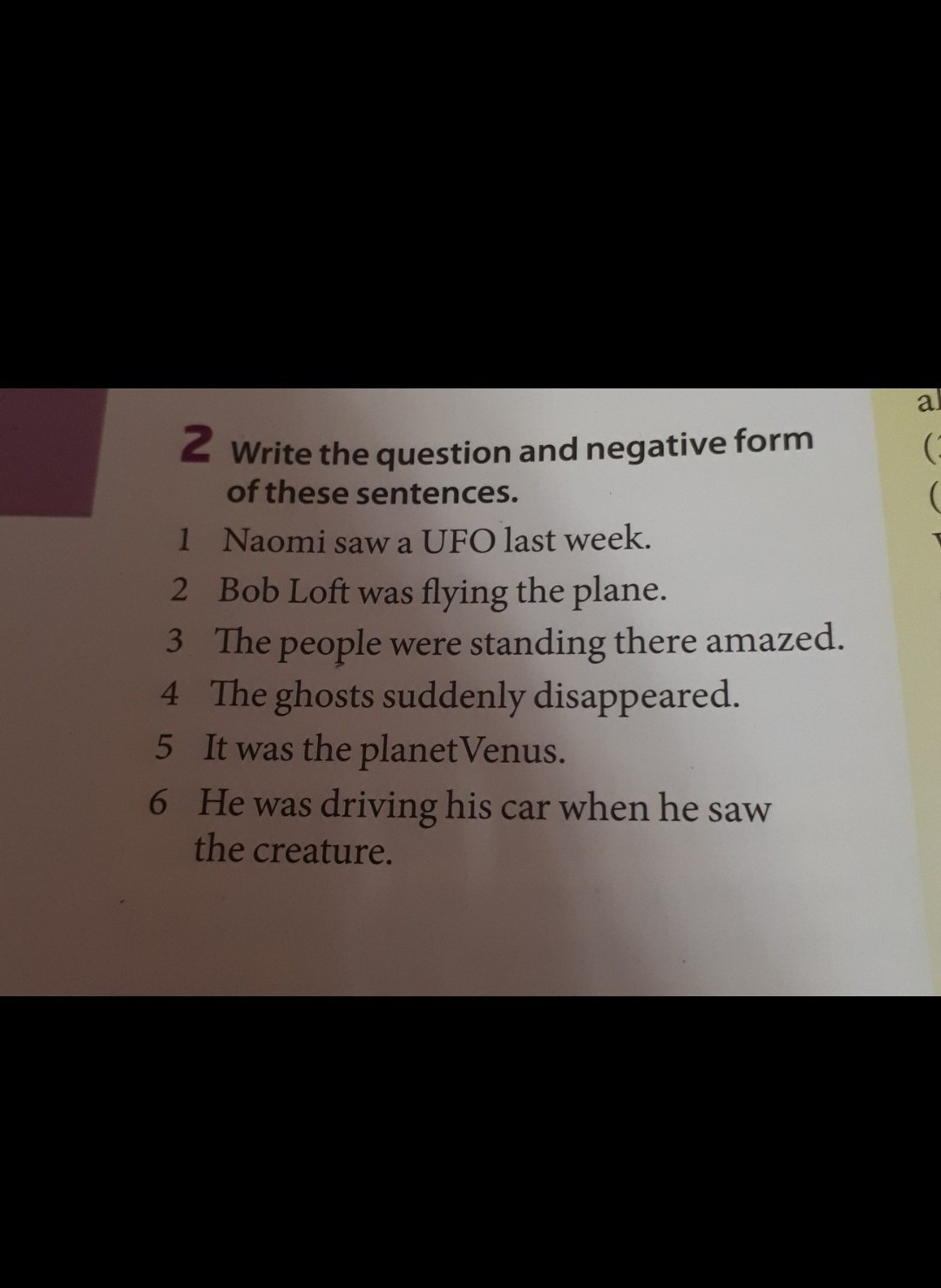 1Отрицательные (все) Naomi didn't saw a UfO last week. Bob loft wasn't flying on the plane the people weren't standing there amazed. The ghosts didn't desappeared suddenly. It wasn't the planet Venus. He wasn't driving his car when he saw the creature.