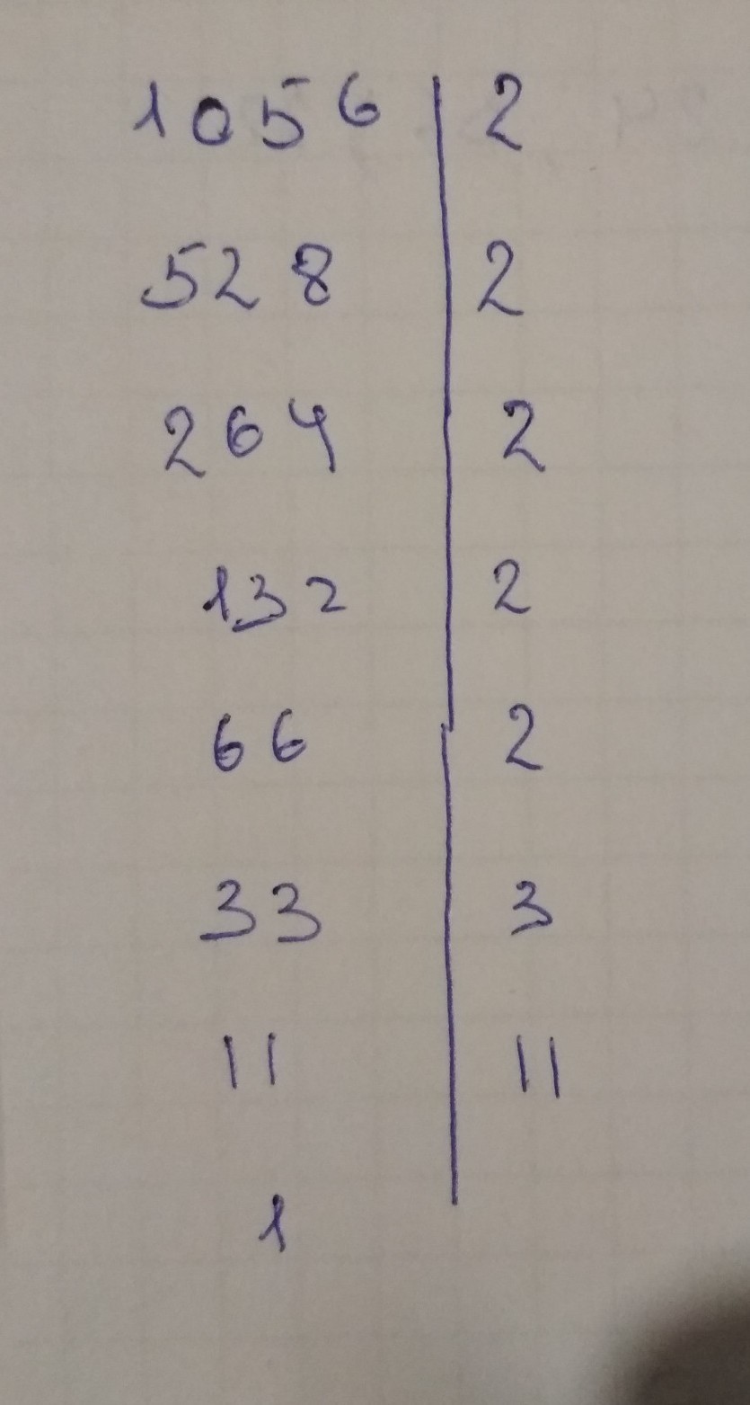 число делишь на удобные, чтобы было легче, то есть 1056 мы делим на 2 , выходит 528 и чтобы не заморачиваться с трудным делителями снова делим на 2 и так постоянно пока вот не добираемся до 11 , оно не делаться цело никак, поэтому делим само на себя, вот так , надебсь доступно