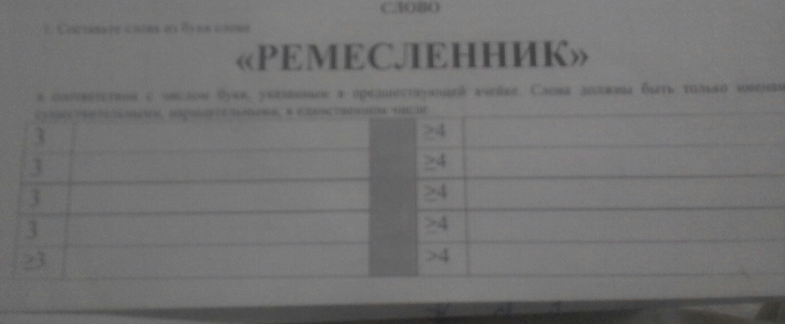 Составьте слова из букв слова "ремесленник" в соответствии с числом букв, указанным в предшествующей ячейке. Слова должны быть только именами существительными, нарицательными, в единственном числе