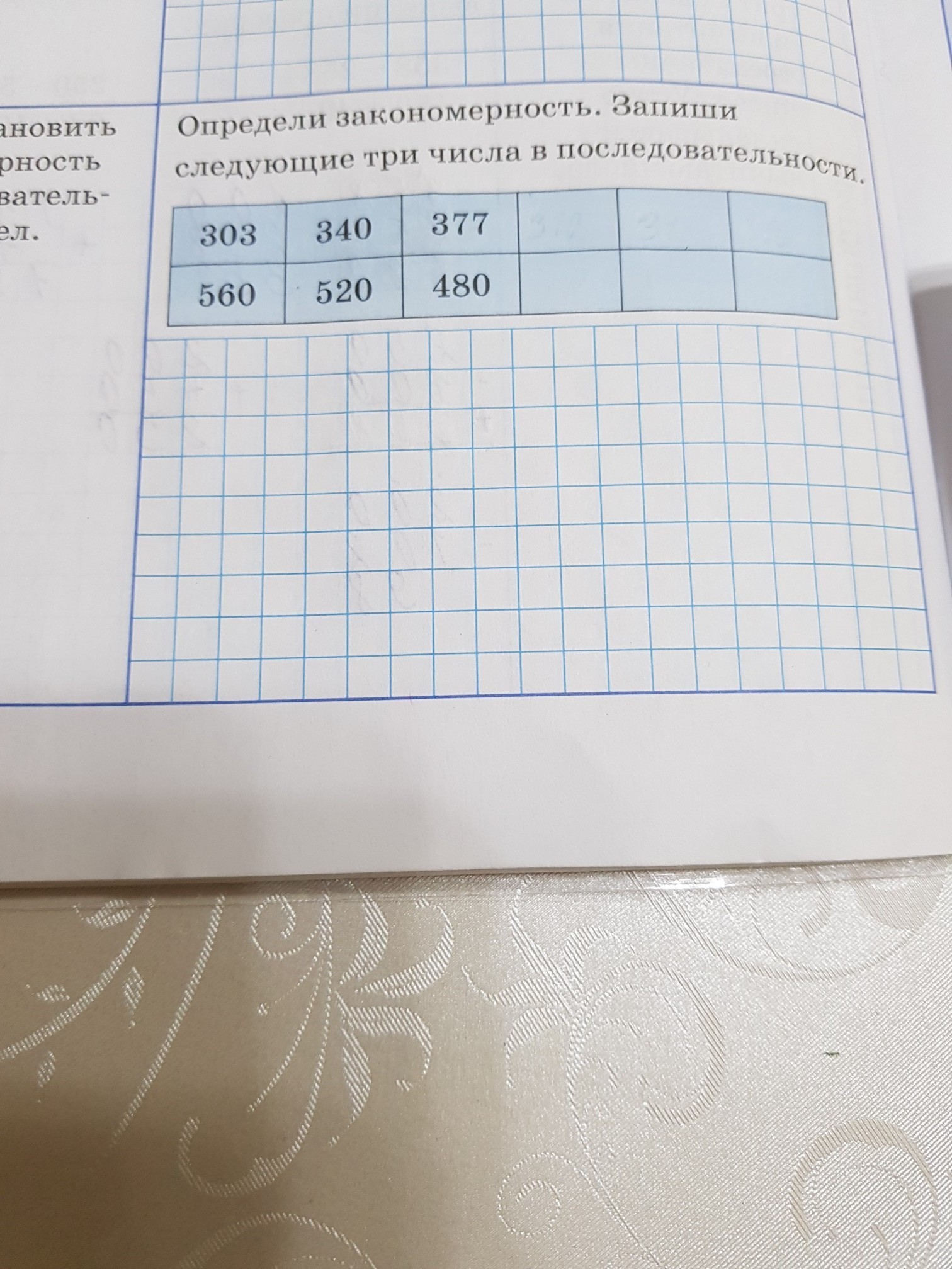 Первое Закономерность в том что к последующему числу прибавляют 37,тоесть 303+37=340