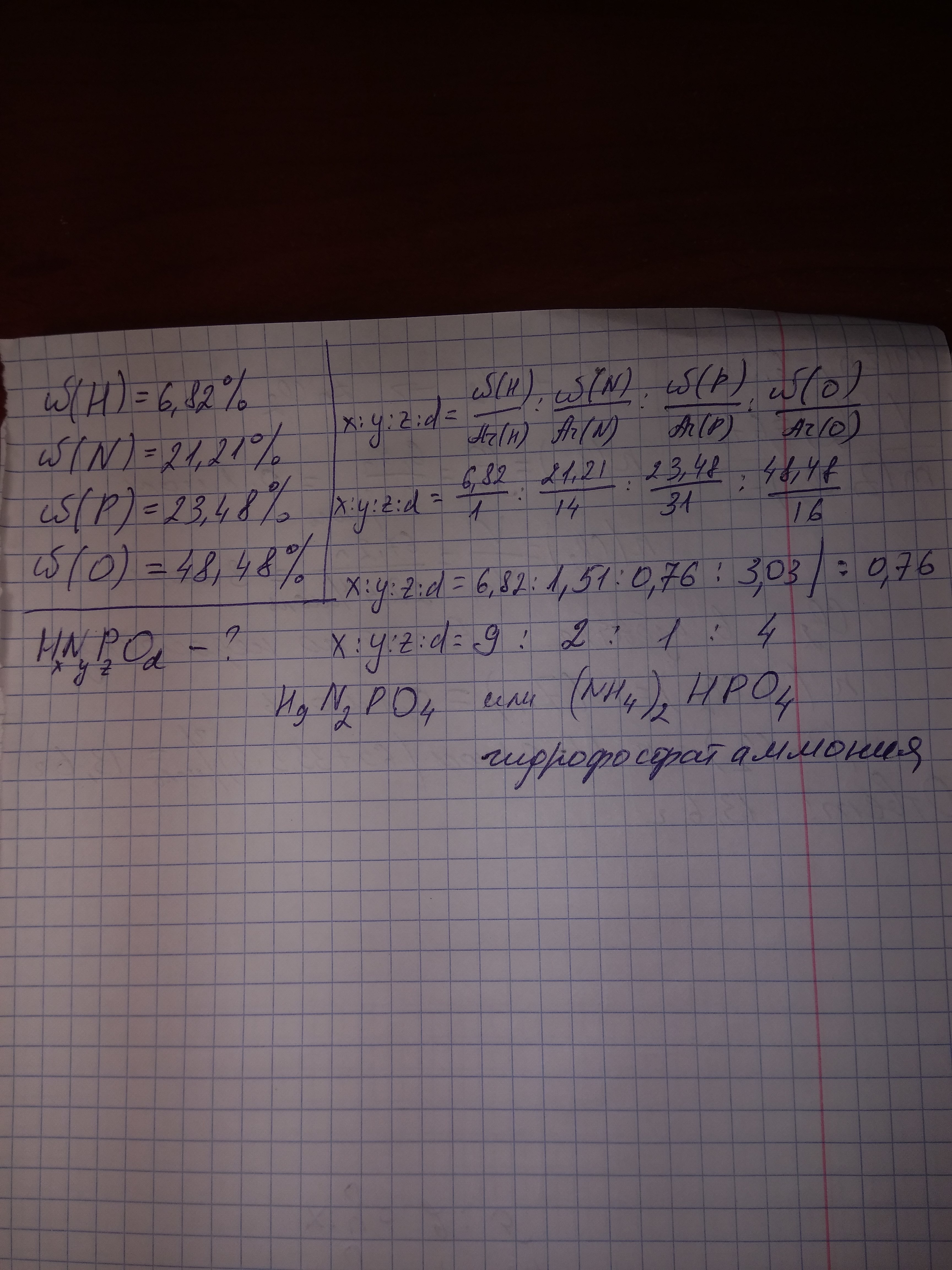 Определите молекулярную формулу соли, в которой содержится 6.82% водорода, 21.21% азота, 23.48% фосфора и 48.48% кислорода.