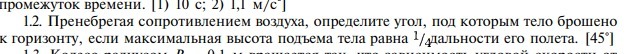 hm/L=1/4 hm=V0^2*sin^2a/2*g L=V0^2*sin(2*a)/g=V0^2*2*sina*cosa/g hm/L=tga/4 tga=1 a=45 градусов