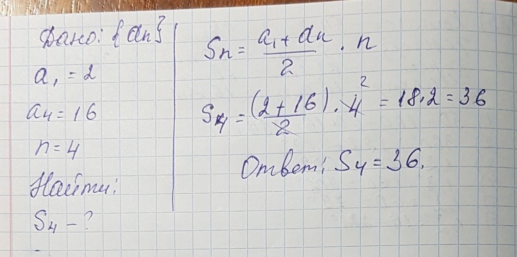 Ребятушки, помогите!!! Нужно найти Аn сумму, если А1=2, А4=16, n=4. Вроде и знаю, в какую формулу подставлять, но что-то не получается. Буду очень благодарна, если поможете.