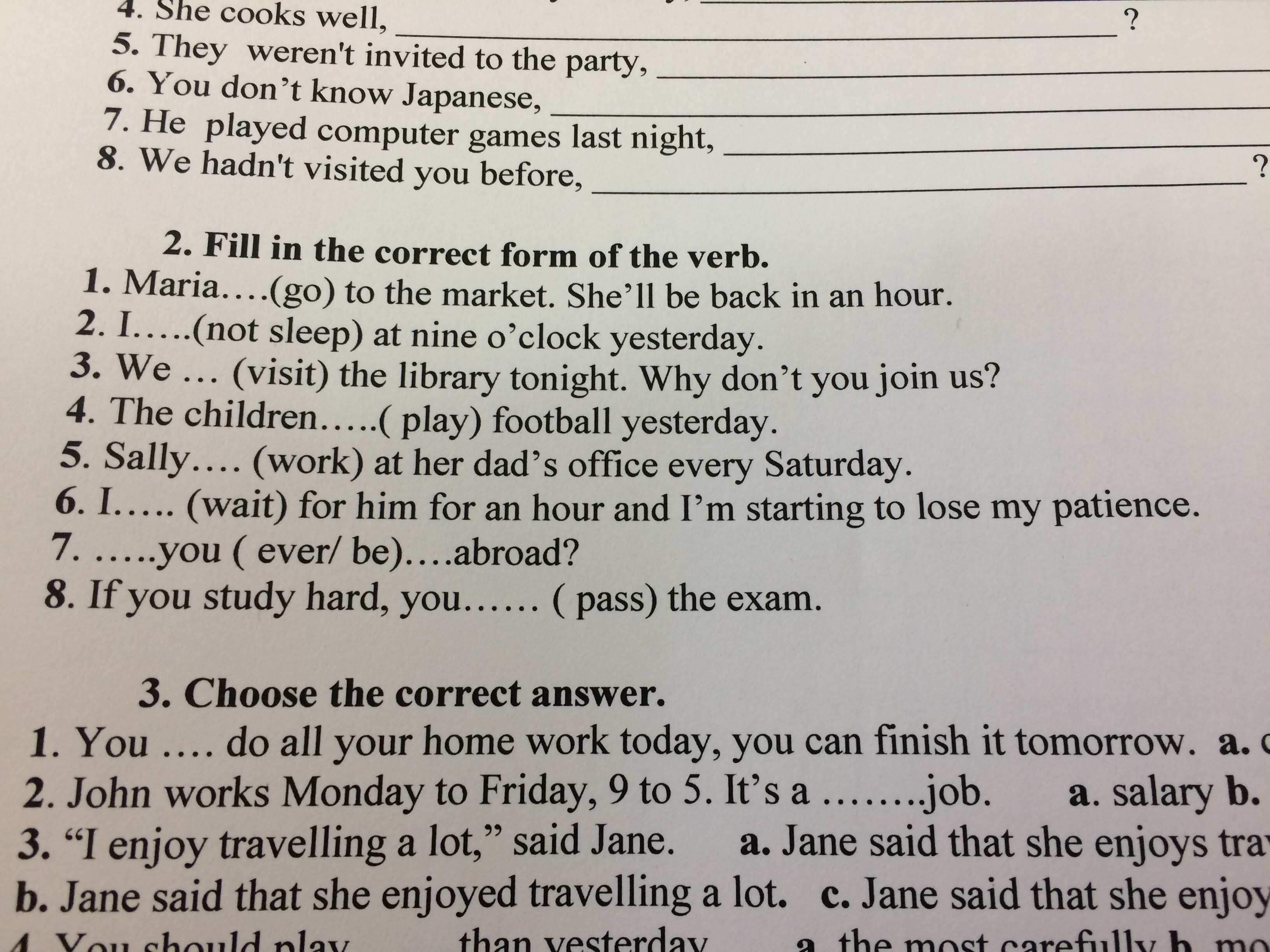 1) is going, 2) didn't sleep, 3) will visit, 4) played, 5) world, 6) am waiting, 7)Are you ever abroad? 8) will pass