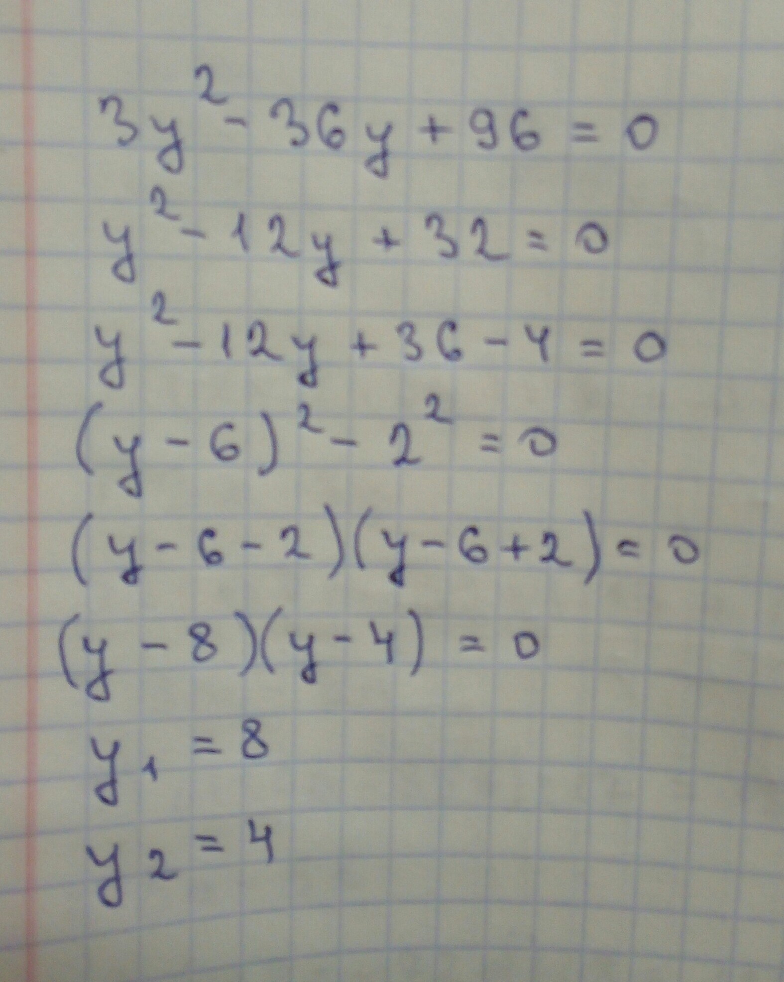 -3y²+36y-96=0| :(-3)