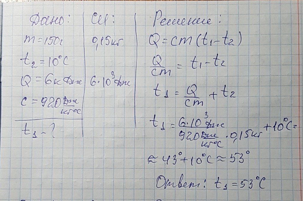 При охлаждении куска алюминия массой 150 г до температуры 10°C выделилось 6 кДж теплоты. Определи, какой была температура алюминия до охлаждения. Удельная теплоёмкость алюминия равна 920 Дж/(кг·°C).