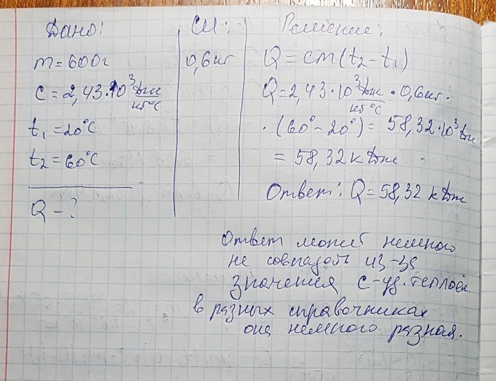 Какое количество теплоты потребуется для нагревания 600 г. глицерина от температуры 20 °С до температуры 60 °С