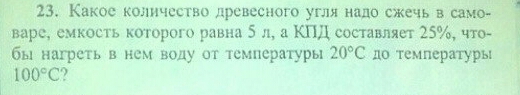 какое количество древестного угля нужно сжечь в самоваре, ёмкость которого равна 5 л, а КПД составляет 25%, чтобы нагреть в нем воду от 20º до 100º