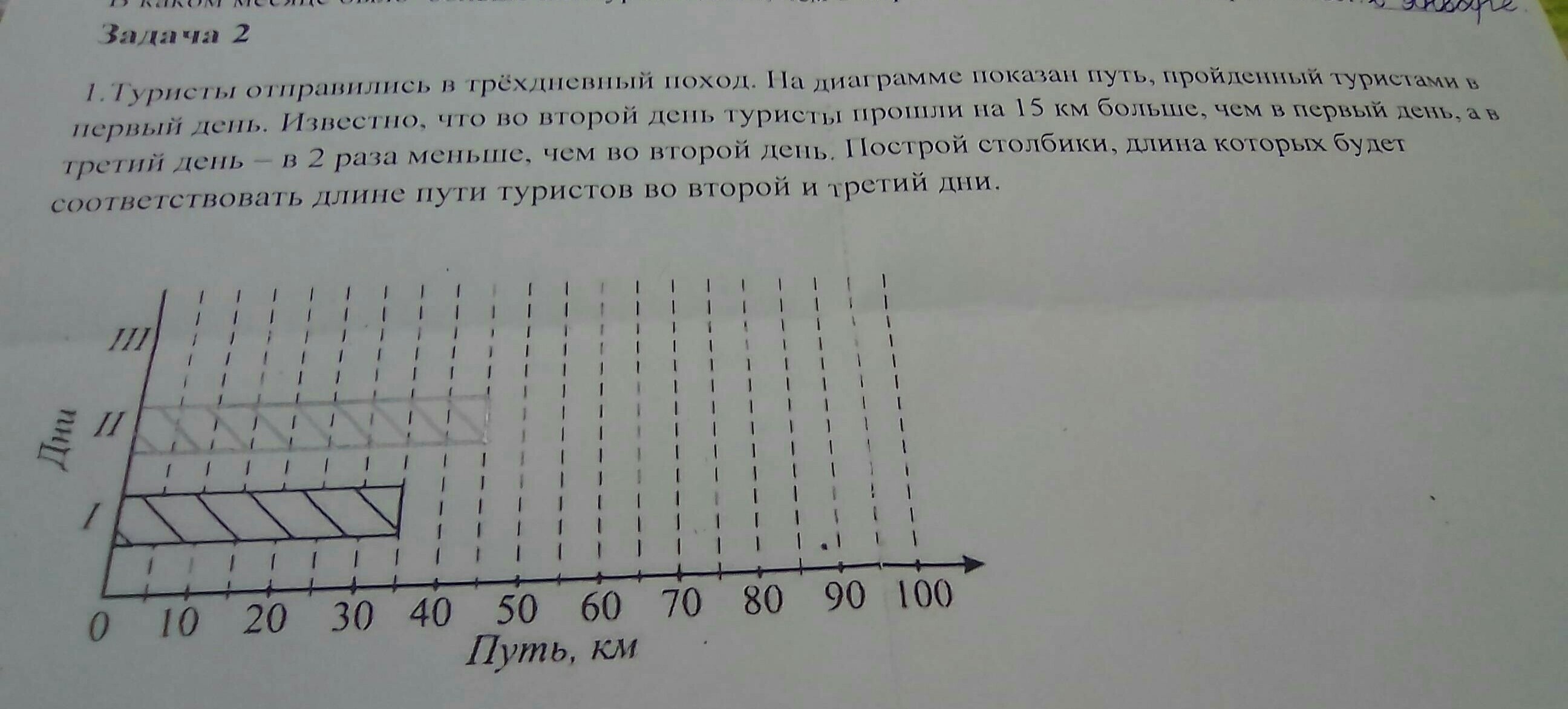 ну. если я все правильно поняла, то первый день - 30 км, второй день - 30+15=45 км, третий день - в два раза меньше, чем во второй, значит, 45:2=22,5 км или 22 1/2 км