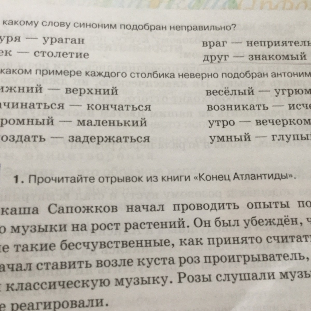 неверный пример антонимов: опоздать - задержаться; утро - вечерком