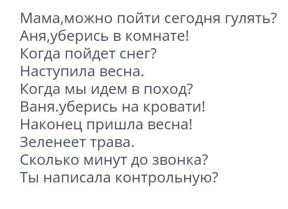 Когда пойдёт снег? Наступила весна. Ваня уберись на кровати! Зеленеет трава. Сколько минут осталось до звонка? Мама, можно пойди сегодня погулять?