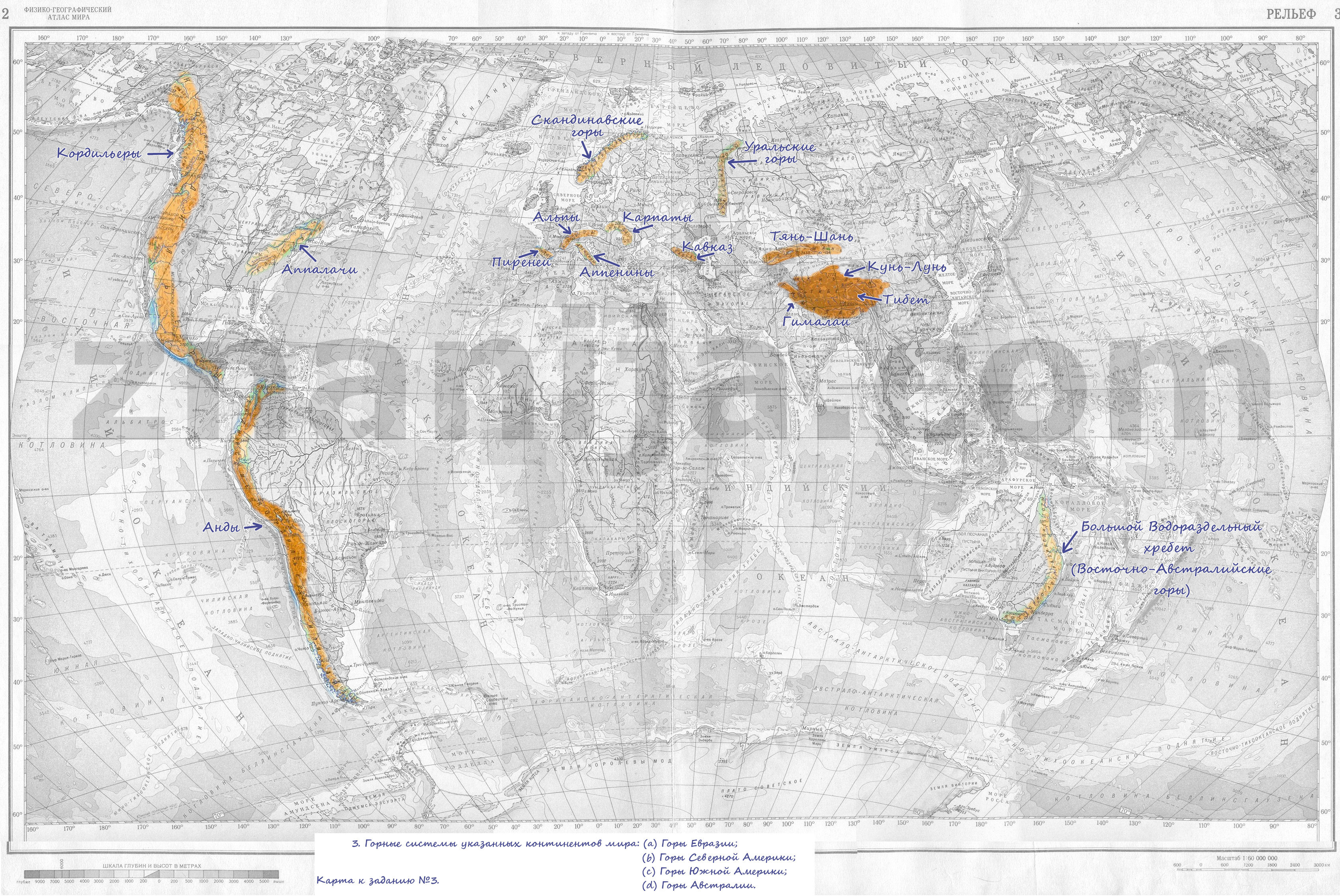 (a) Горы Евразии: Пиренеи, Альпы, Карпаты, Аппенины, Скандинавские горы, Уральские горы, Кавказ, Гималаи, Тибет, Кунь-Лунь, Тянь-Шань;