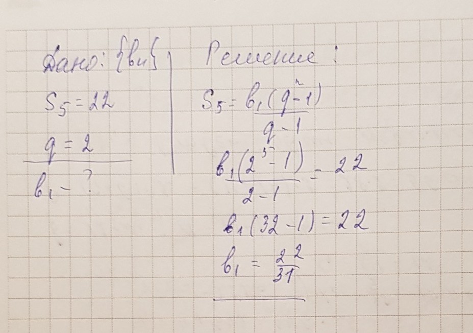 Cумма пяти первых членов геометрической прогрессии равна 22, а знаменатель этой прогрессии равен 2. Найдите первый член этой прогрессии.