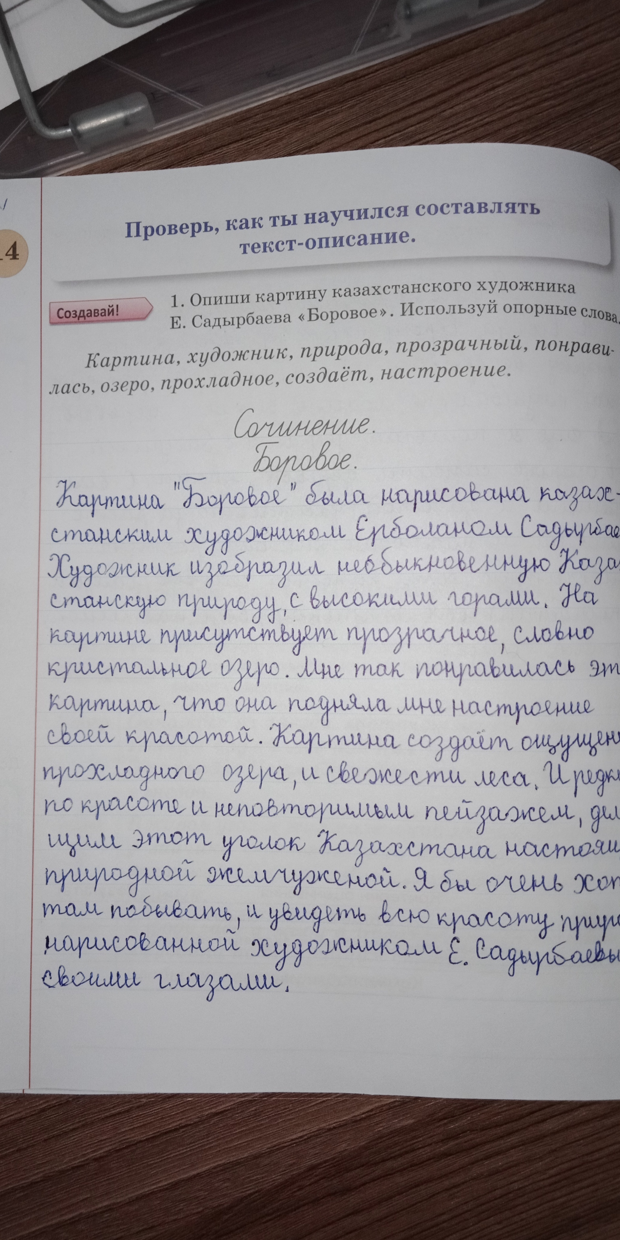 1.Опиши картину казахстанского художника Е.Садырбаева<Буровое>.Используй опорные слова:картина,художник,природа,прозрачный,понравилось,озеро,прохладное,создает,настроене.