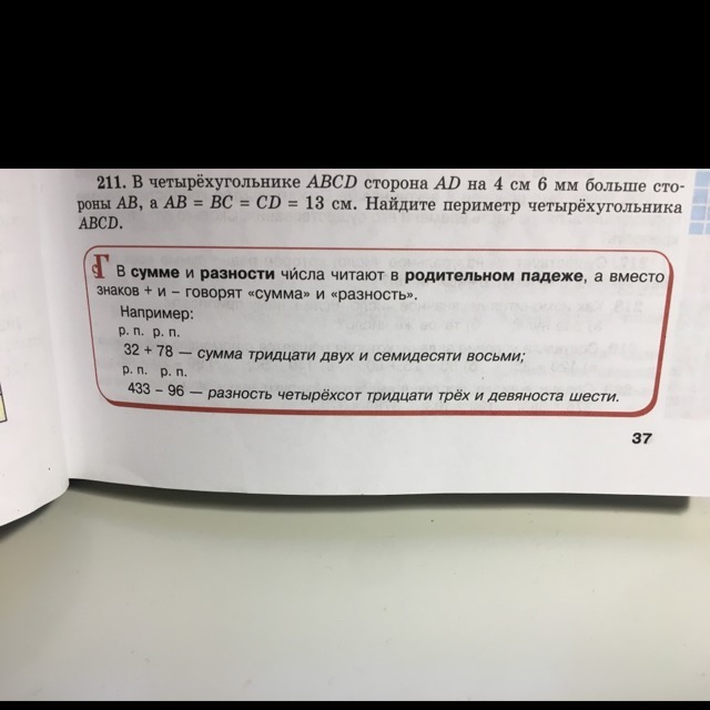 Номер 211. В четырёхугольнике АBCD сторона AD на 4 см 6 мм больше стороны AB, а AB=ВС=СD=13см. Найдите перемирий четырёхугольника ABCD