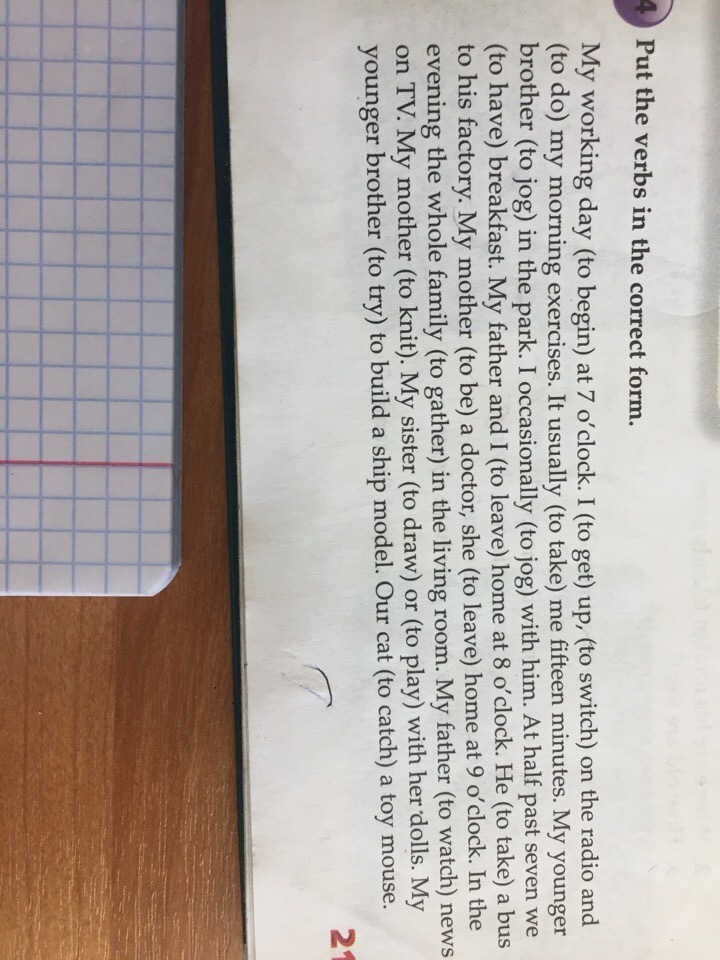 Begins, get, switch, do, takes, jogs, jog, have, leave, takes, is, leaves, gather, watches, knits, draws, plays, tries, cathes
