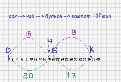 сок + 18 мин + чай + (20-18)мин + бульон + 17 см + компот = 37 мин , по условию выпивается все мгновенно, т.е. все жидкости равенства - нули.