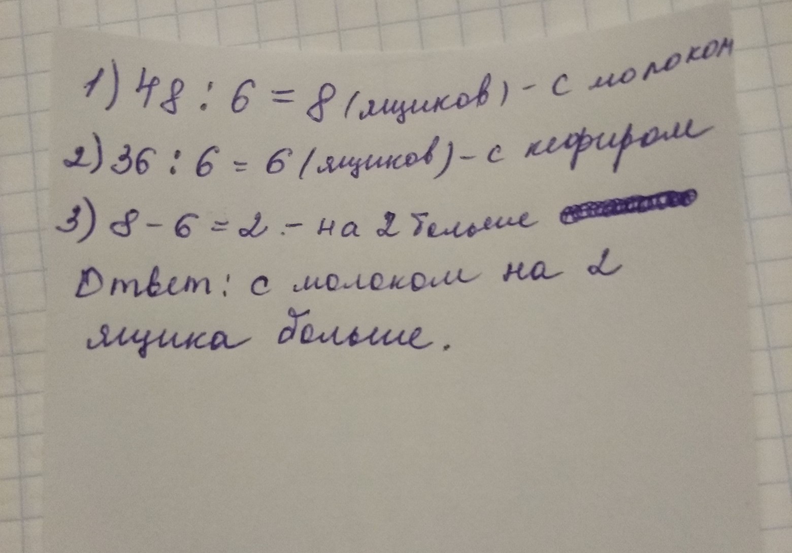 48 пакетов с молоком и 36 с кефиром расфасовали в одинаковые ящики по 6 пакетов в каждый. На сколько больше ящиков с молоком,чем с кефиром?