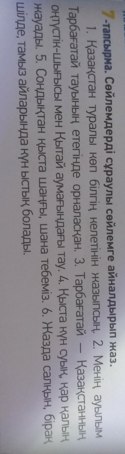 ПОМОГИТЕ пожайлуста сделать ҚАЗАҚ.ТІЛІ.ПОЖАЙЛУСТА!!!"Сөйлемдерді сұраулы сөйлемге аналдырып жаз".