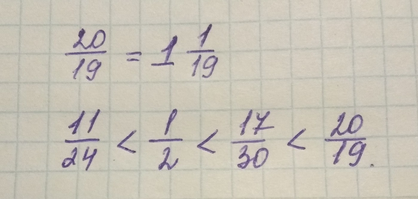 Расположите числа 1/2, 20/19, 11/24, 17/30 в порядке возрастания,НО С РЕШЕНИЕМ И ОБЪЯСНЕНИЕМ, ПОСТАРАЯСЬ НЕ ПРИВОДИТЬ К ЗНАМЕНАТЕЛЮ 2280 (ОН СЛИШКОМ БОЛЬШОЙ, МНЕ НЕ ПОВЕРЯТ ЧТО Я ТАК СДЕЛАЛА)