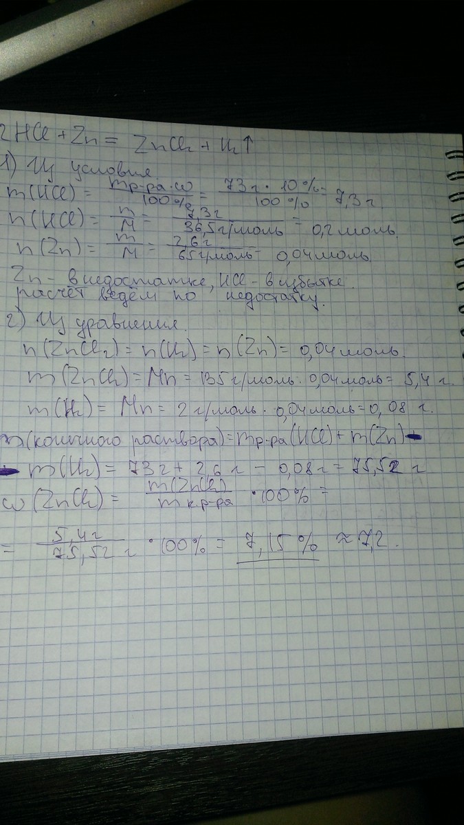 В растворе массой 73 г с массовой долей хлороводорода 10 % растворили 2.6 гр цинка . Рассчитайте массовою долю соли в растворе.