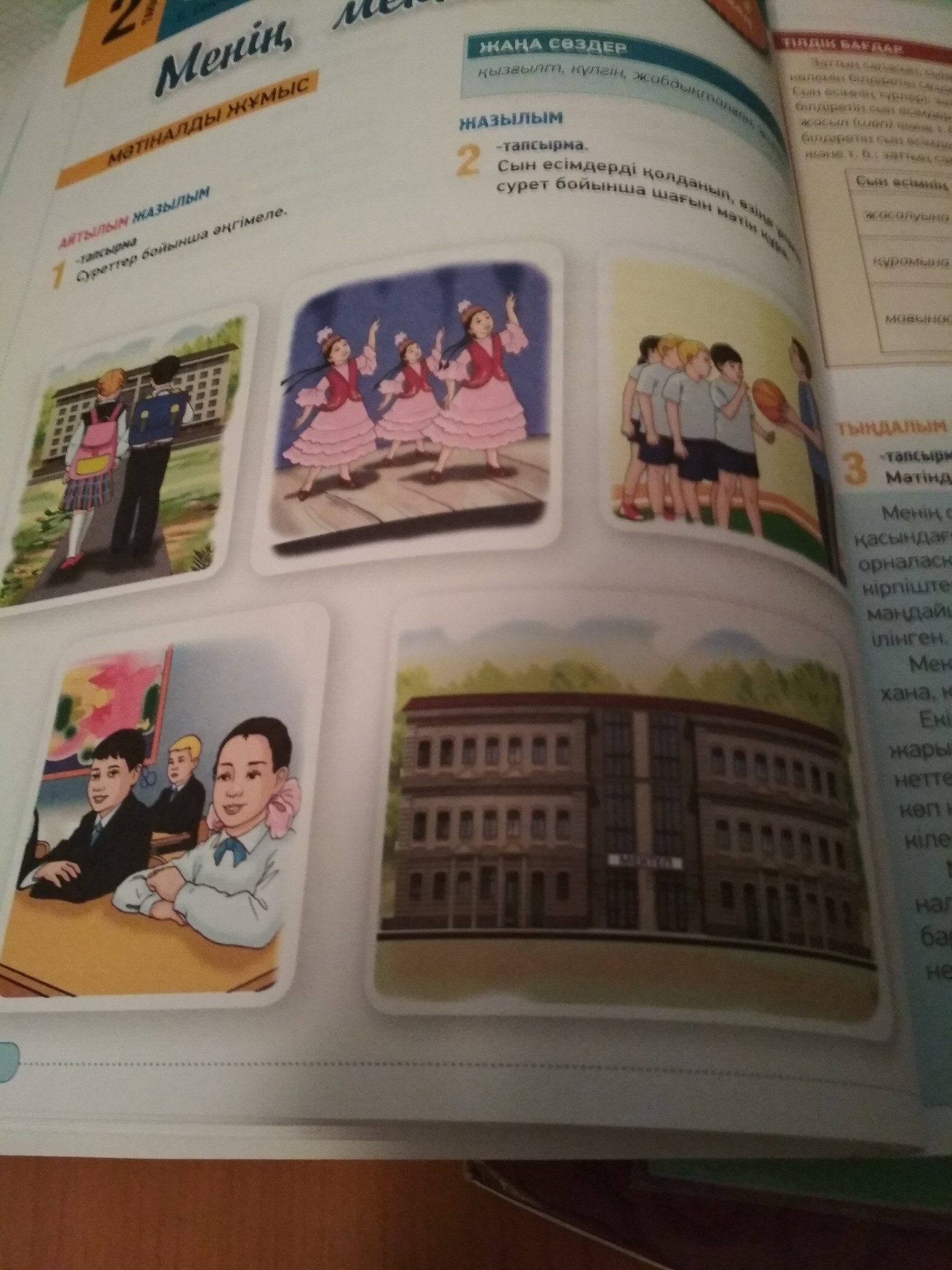 Қыздар би биледе. Балалар дене- шыныктыруда баскетбол ойнайды. Безден мектеп уш кабатты ол улкен, адемі . Оқушылар сабақ оқиды.
