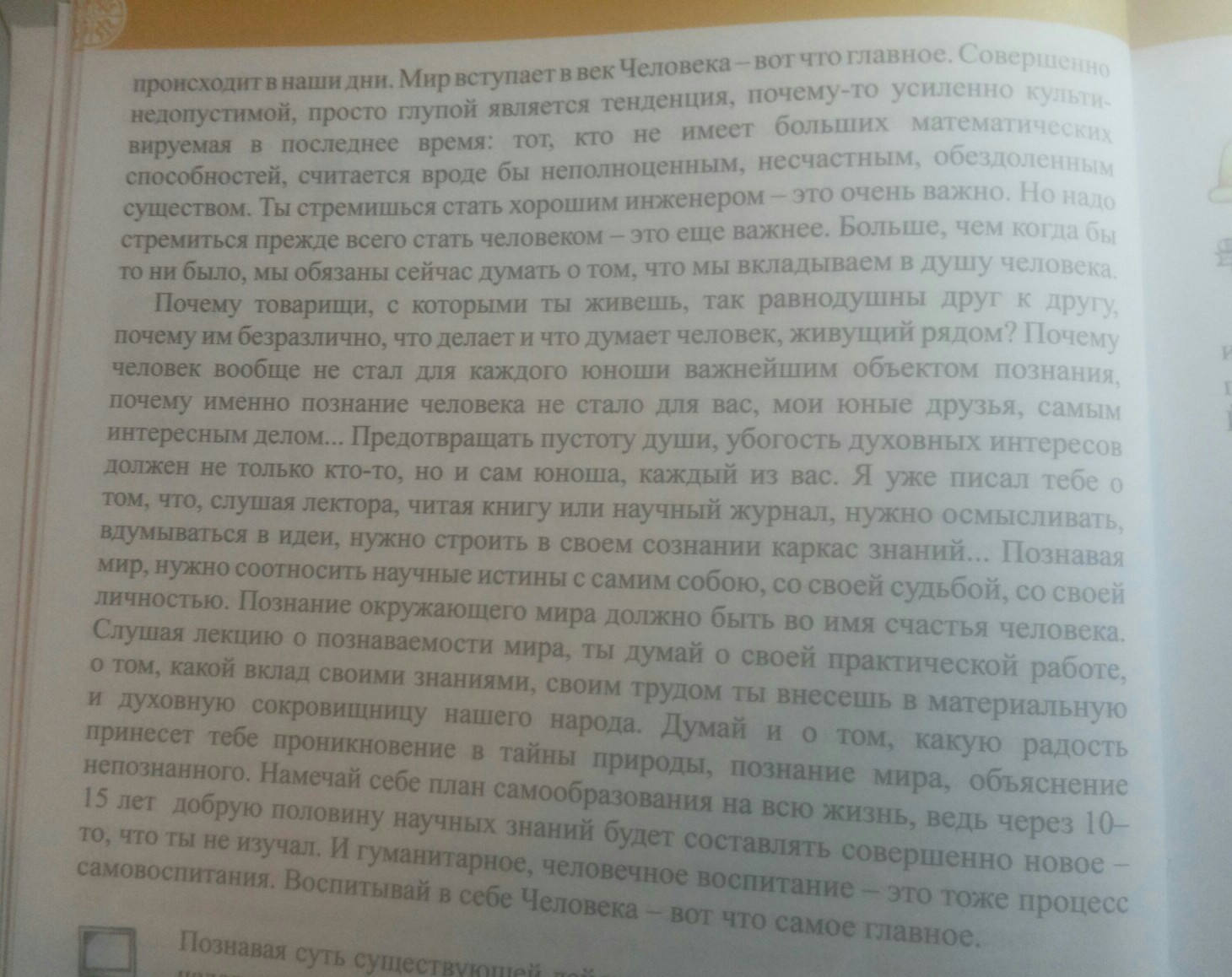 Прочитайте письмо Василия Сухомлинского к сыну. Какое знание известный педагог считает самым главным? Что имеет в виду В. Сухомлинский, говоря, что мы вступаем в "век Человека"? Каким вы представляете себе этот век? Какими нравственными качествами будут обладать люди? Какие условия для жизни будут у детей, стариков? Каково будет место природы, животных в этом мире? Напишите ответ великому педагогу, задайте ему вопросы, которые волнуют вас, об истине, смысле человеческой жизни, предназначении человека.